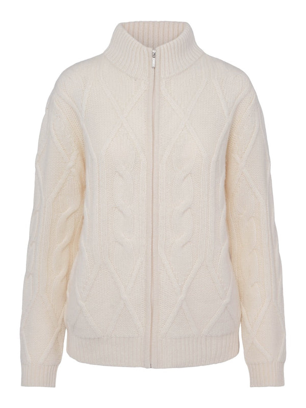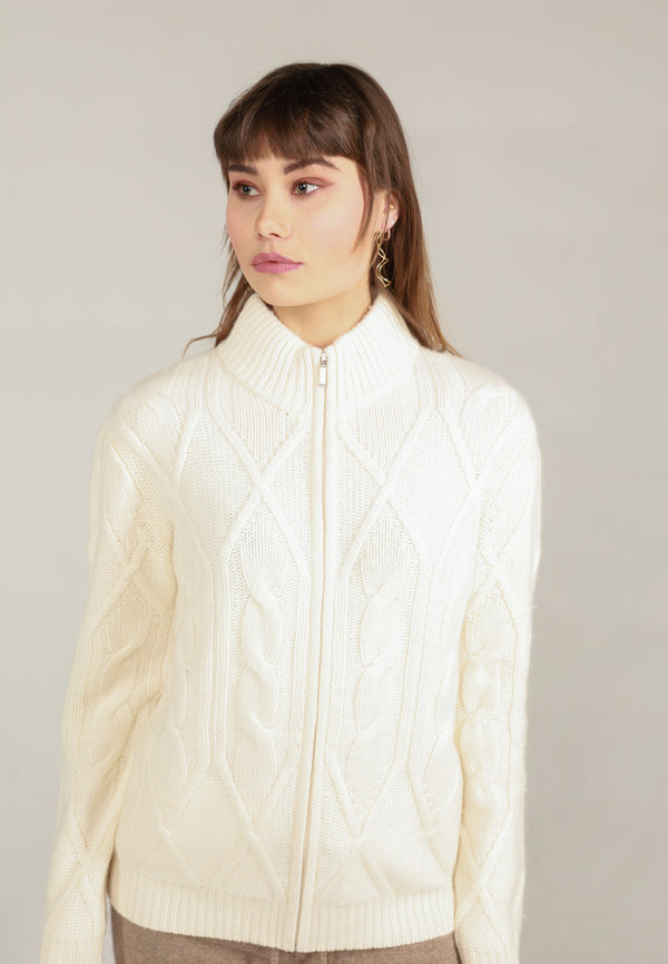 One of our thickest cashmere garments! The jacket features a beautiful braided pattern and a creamy white color!"