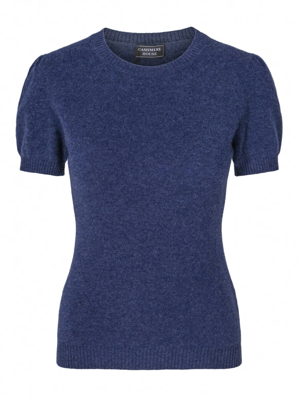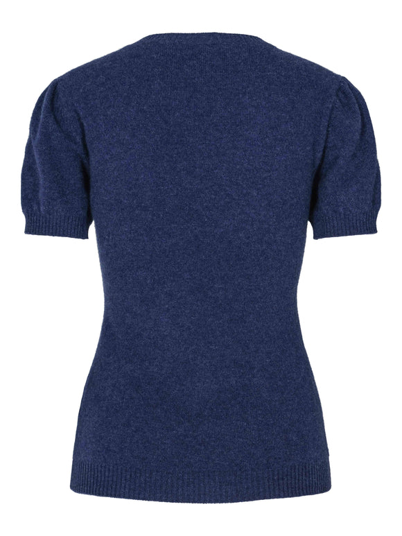 Short-sleeved denim cashmere sweater with puff sleeves